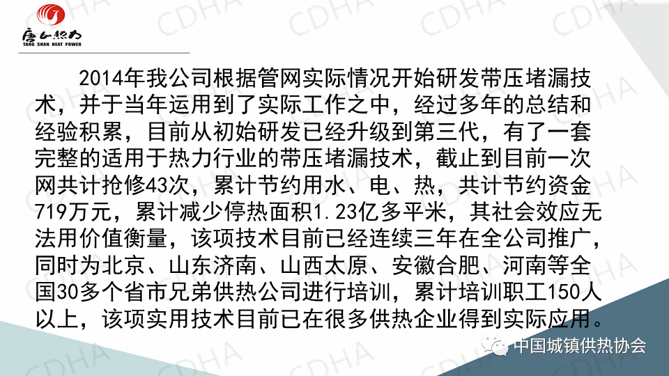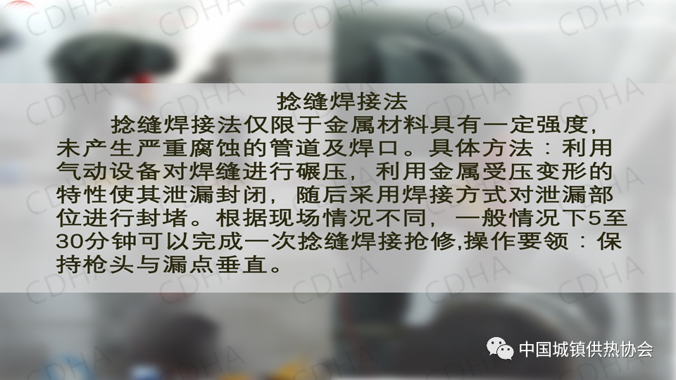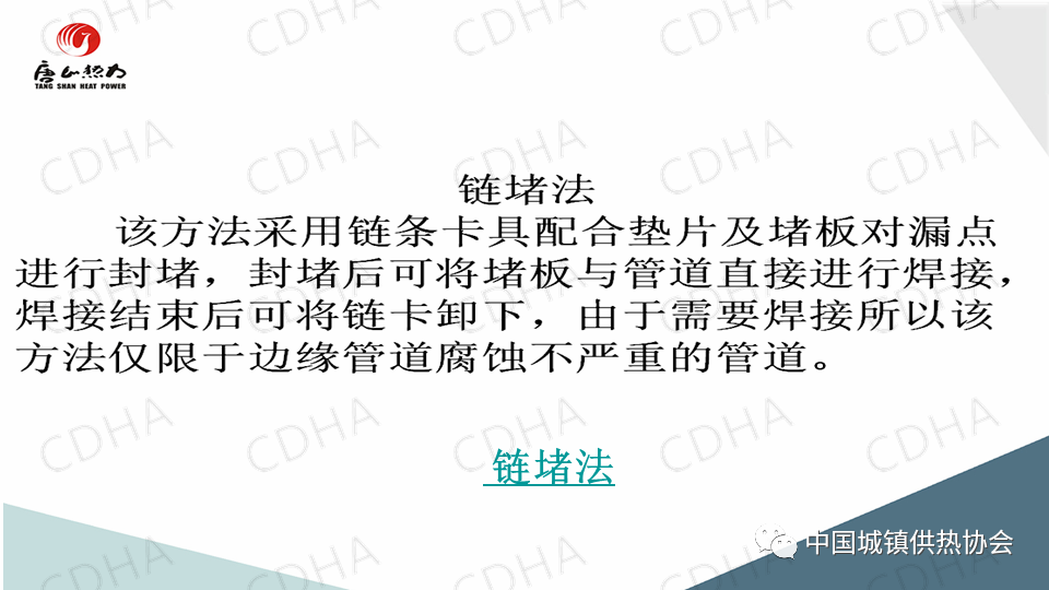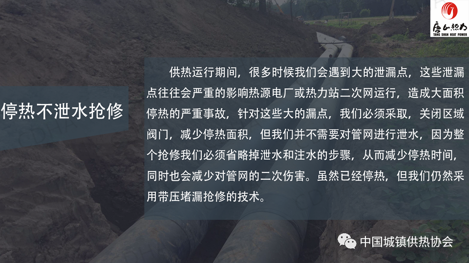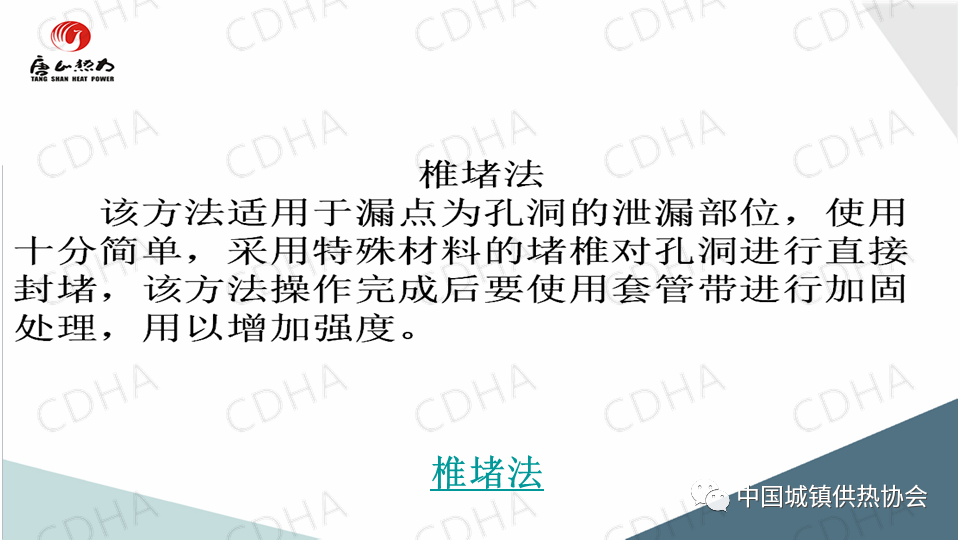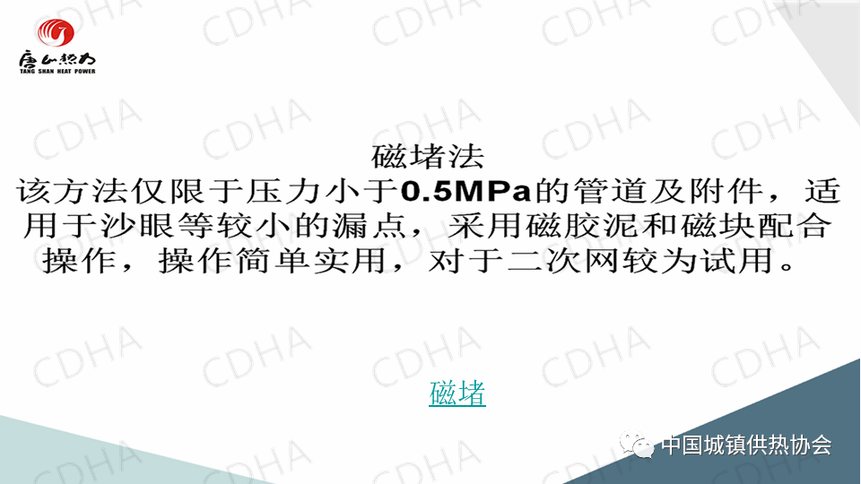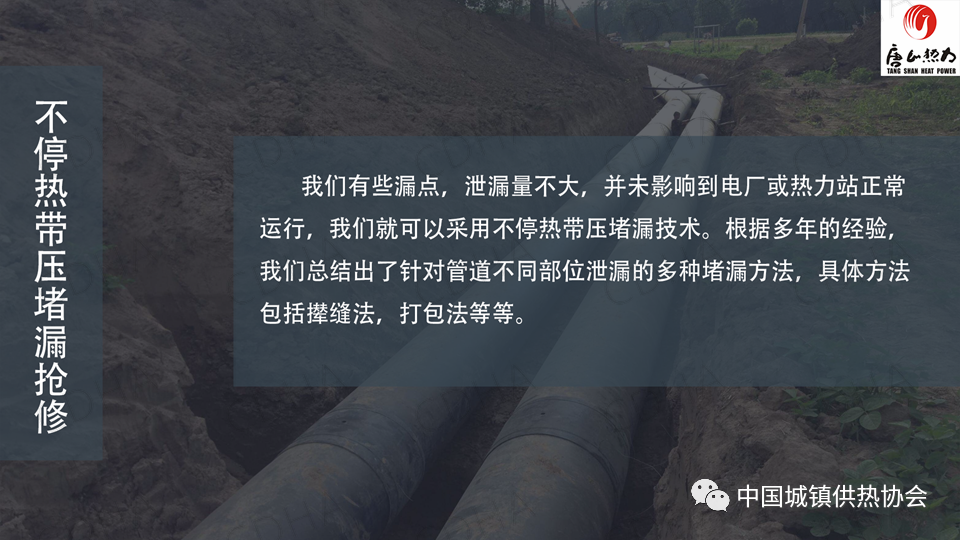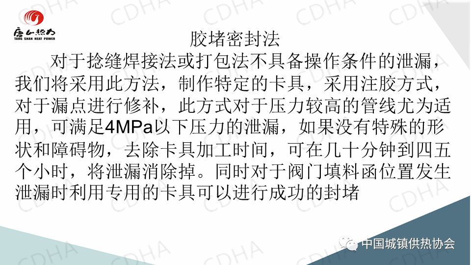2020年7月24日,中國城鎮(zhèn)供熱協(xié)會通過直播形式舉辦了供熱搶修標準宣貫及搶修搶險經(jīng)驗交流大會。唐山市熱力總公司管網(wǎng)公司副經(jīng)理薛山跟大家分享了供熱應急搶險中帶壓堵漏搶險技術,并介紹了“膠堵密封法”“鏈堵法”“椎堵法”“放風泄水根部”“閥門填料函”等堵漏方法。課件內(nèi)容分享如下: