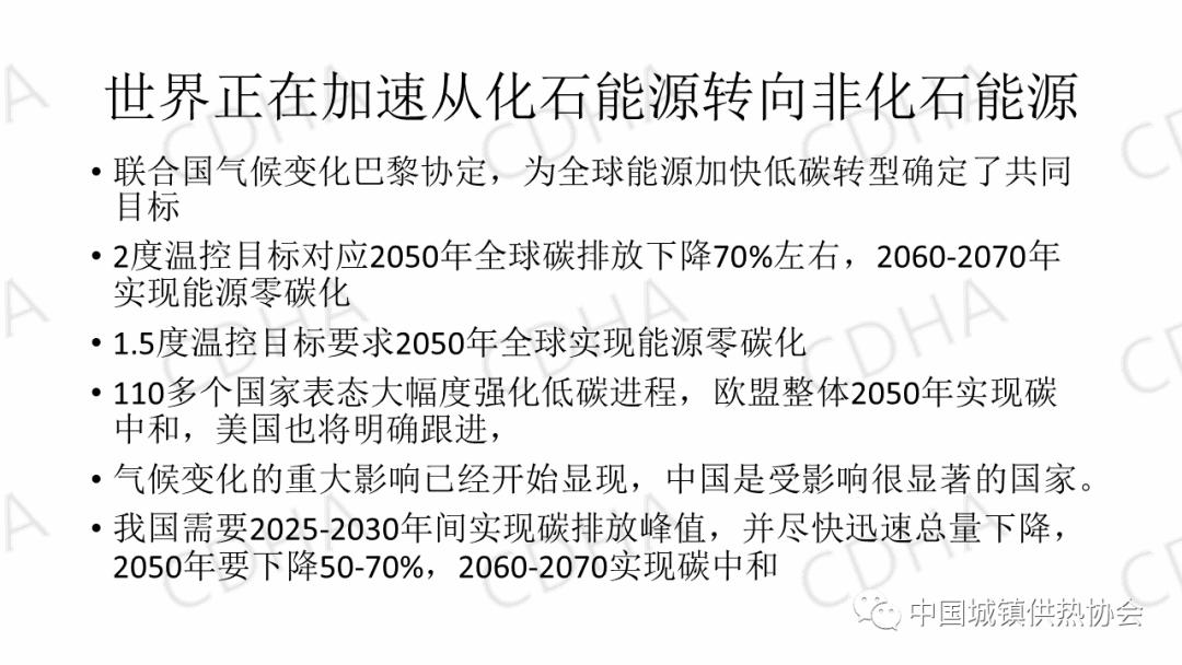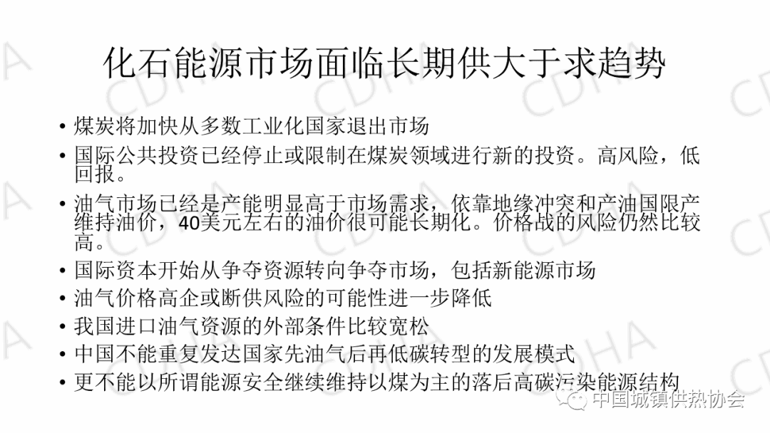 現(xiàn)在歐盟整體上來講,已經(jīng)公布歐盟28個(gè)國(guó)家要整體實(shí)現(xiàn)2050年碳中和。現(xiàn)在的幾乎所有的工業(yè)化國(guó)家,以及一批發(fā)展中國(guó)家,都表態(tài)要實(shí)現(xiàn)2050年的碳中和。全球的能源體系以及用能體系必然要出現(xiàn)一個(gè)非常巨大的變化。從能源的供應(yīng)和轉(zhuǎn)換,到能源的消費(fèi)的技術(shù)都會(huì)有重大的變化,甚至是一種顛覆性的變化。比如說拿供熱講,如果以可再生能源為主,終端消費(fèi)以電力為主,那么現(xiàn)在我們所進(jìn)行的以熱網(wǎng)為主的這種供熱系統(tǒng)就受到了一個(gè)巨大的挑戰(zhàn)。低碳轉(zhuǎn)型在今后的30年內(nèi),要把現(xiàn)有的供熱系統(tǒng)基本上替換掉。
