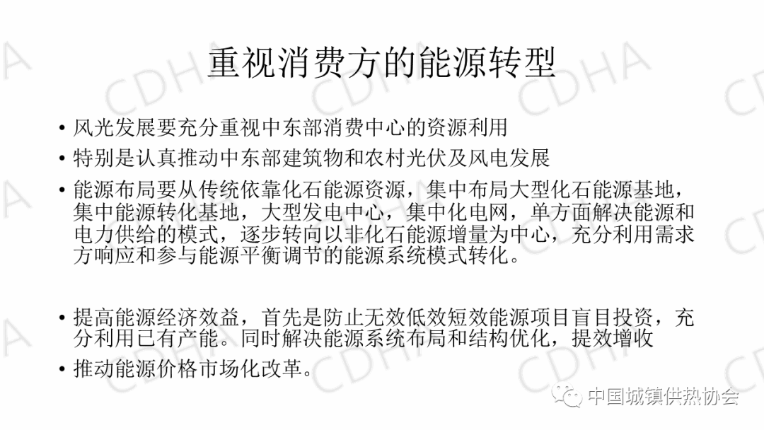 消費(fèi)方的能源轉(zhuǎn)型,應(yīng)該充分重視中東部消費(fèi)中心的資源利用問題,特別是認(rèn)真推動(dòng)中東部建筑物和農(nóng)村光伏及風(fēng)電發(fā)展。江億院士做過很好的研究,如果把中東部的這些建筑物有效的利用起來,而且還留有余地,那么也都是10億20億千瓦的這種潛力可以干。這個(gè)能源布局要從傳統(tǒng)依靠化學(xué)能源資源集中布局大型化學(xué)能源基地,集中能源轉(zhuǎn)化基地,大型發(fā)電中心,集中化的電網(wǎng),單方面來解決能源供應(yīng)保障問題,這種供給模式要逐漸轉(zhuǎn)向以非化石能源能源增量為中心,充分利用需求方響應(yīng)和參與能源平衡調(diào)節(jié)的能源系統(tǒng)新模式轉(zhuǎn)換。這對(duì)我們建筑行業(yè),對(duì)我們的采暖行業(yè)還是有很大的發(fā)展新挑戰(zhàn)和新機(jī)遇的。