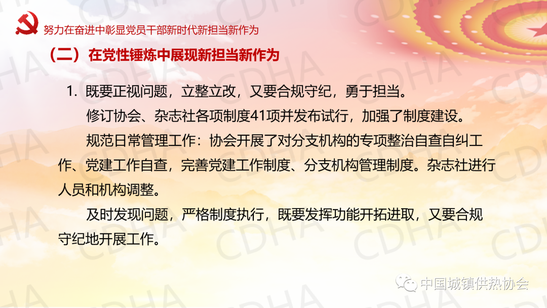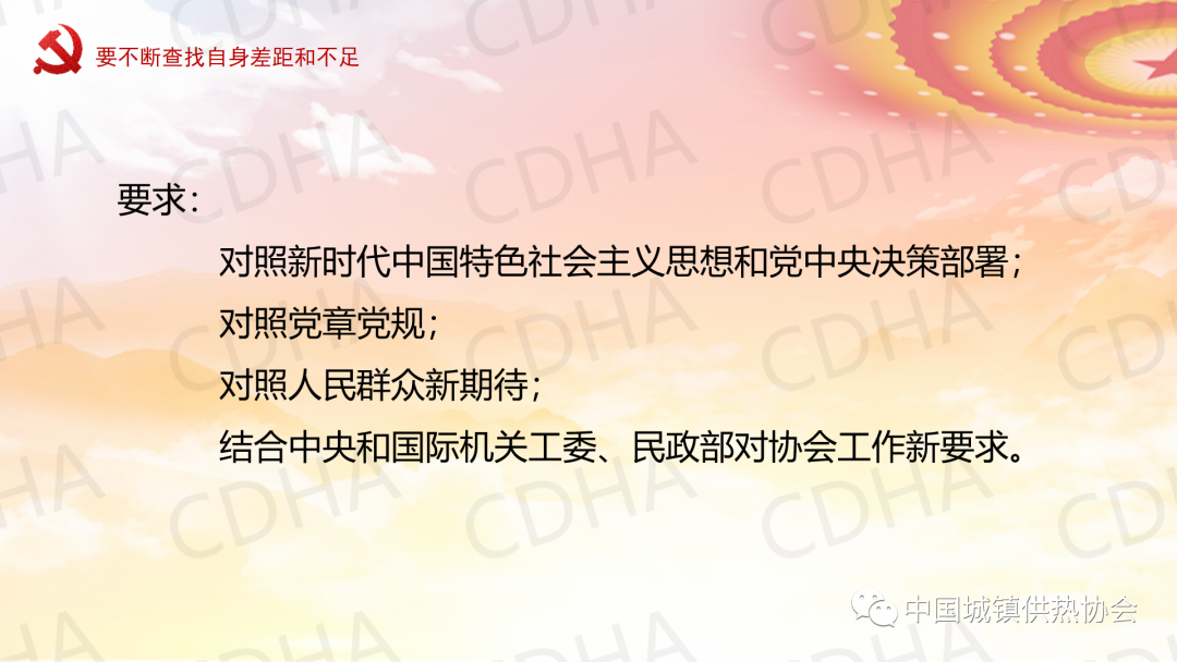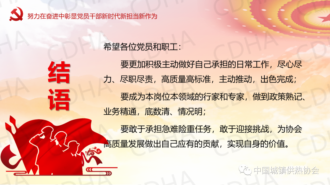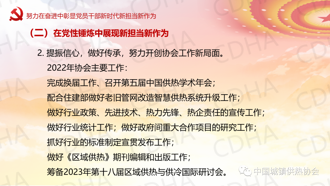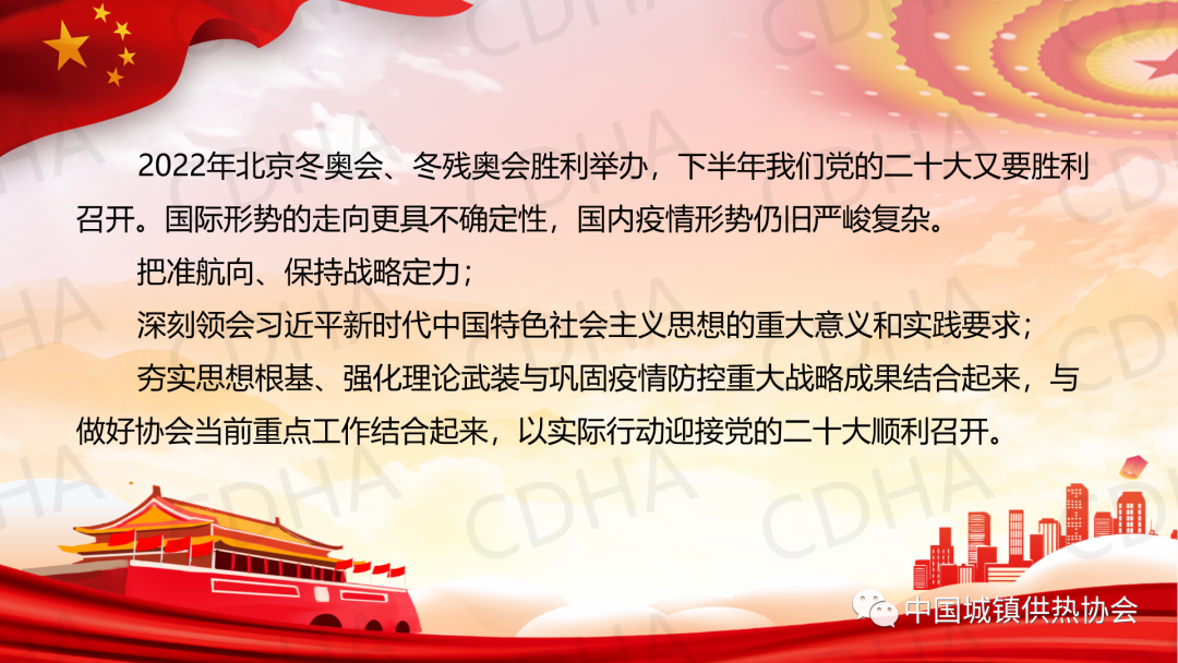 5月23日,中國城鎮(zhèn)供熱協(xié)會黨支部采用線上與線下相結(jié)合的方式召開黨員大會,邀請理事長劉水洋同志為協(xié)會黨支部講黨課,黨支部全體7名黨員均參加了黨課學習。劉水洋表示:一要正確認識和把握當前內(nèi)外環(huán)境發(fā)生的深刻變化;二要始終牢記初心使命;三要不斷查找自身差距和不足;四要努力在奮進中彰顯黨員干部新時代新?lián)斝伦鳛椤?/span>劉水洋總結(jié)提出:希望各位黨員和職工要更加積極主動做好自己承擔的日常工作,盡心盡力、盡職盡責,高質(zhì)量高標準,主動推動,出色完成;要成為本崗位本領(lǐng)域的行家和專家,做到政策熟記、業(yè)務(wù)精通,底數(shù)清、情況明;要敢于承擔急難險重任務(wù),敢于迎接挑戰(zhàn),為協(xié)會高質(zhì)量發(fā)展做出自己應(yīng)有的貢獻,實現(xiàn)自身的價值。