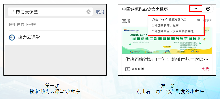 直播平臺微信小程序“熱力云課堂”近日上線試運(yùn)行,大家可以在微信小程序中搜索“熱力云課堂”,點(diǎn)擊“添加到我的小程序”,就可以通過微信小程序觀看直播及回放內(nèi)容。