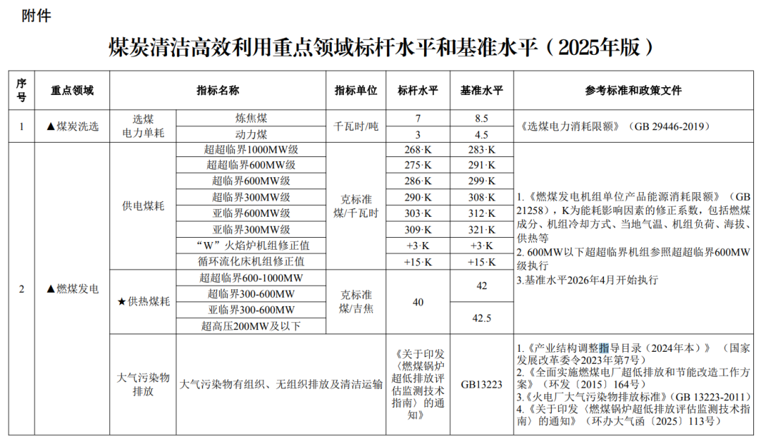 12月17日,國家發(fā)展改革委員會(huì)、住房城鄉(xiāng)建設(shè)部等六部門發(fā)布《煤炭清潔高效利用重點(diǎn)領(lǐng)域標(biāo)桿水平和基準(zhǔn)水平(2025年版)》,在此前重點(diǎn)領(lǐng)域能效標(biāo)桿水平和基準(zhǔn)水平的基礎(chǔ)上,將燃煤發(fā)電供熱煤耗、煤制天然氣等納入范圍;對(duì)標(biāo)國內(nèi)外煤炭清潔高效領(lǐng)域先進(jìn)水平,以及國家、地方現(xiàn)行政策、標(biāo)準(zhǔn)中先進(jìn)能效指標(biāo)值和最嚴(yán)格污染物排放要求,完善煤炭清潔高效利用標(biāo)桿水平。