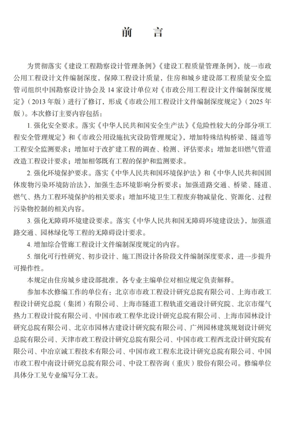 2025年7月31日,住房和城鄉(xiāng)建設(shè)部發(fā)布《市政公用工程設(shè)計(jì)文件編制深度規(guī)定(2025年版)》,自2025年10月1日起施行。本次修訂主要內(nèi)容包括: