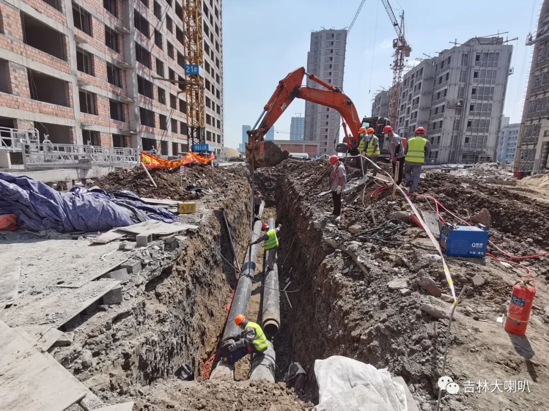 在長(zhǎng)春市凈月高新區(qū)的寶裕悅蘭灣二期的供熱管道施工現(xiàn)場(chǎng),各種工程車輛正在緊張作業(yè),進(jìn)行供熱管道的敷設(shè)。