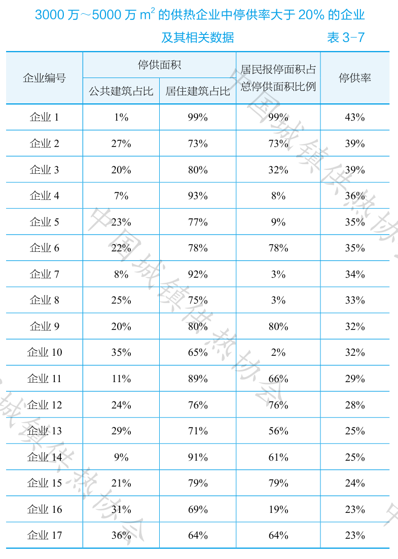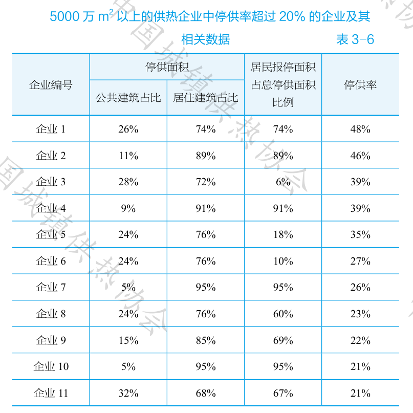 從供熱企業(yè)規(guī)???,供熱面積5000萬㎡以上的22家供熱企業(yè)在網(wǎng)供熱面積23.9億㎡,暫停供熱面積5.0億㎡;停供率最大為48%,平均為21%;停供率超過20%的供熱企業(yè)共有11家,見表3-6。供熱面積3000萬~5000萬㎡的25家供熱企業(yè)在網(wǎng)供熱面積9.2億㎡,暫停供熱面積2.3億㎡; 停供率最大為43%,平均為25%;停供率超過20%的企業(yè)共有17家,見表3-7。