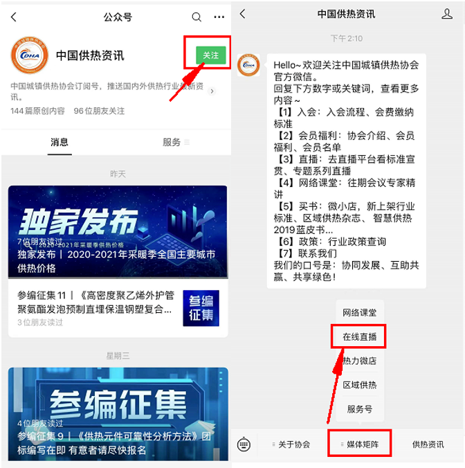 關(guān)注本公眾號(hào)“中國(guó)供熱資訊”,在底部菜單欄“媒體矩陣-在線直播”中點(diǎn)擊觀看。