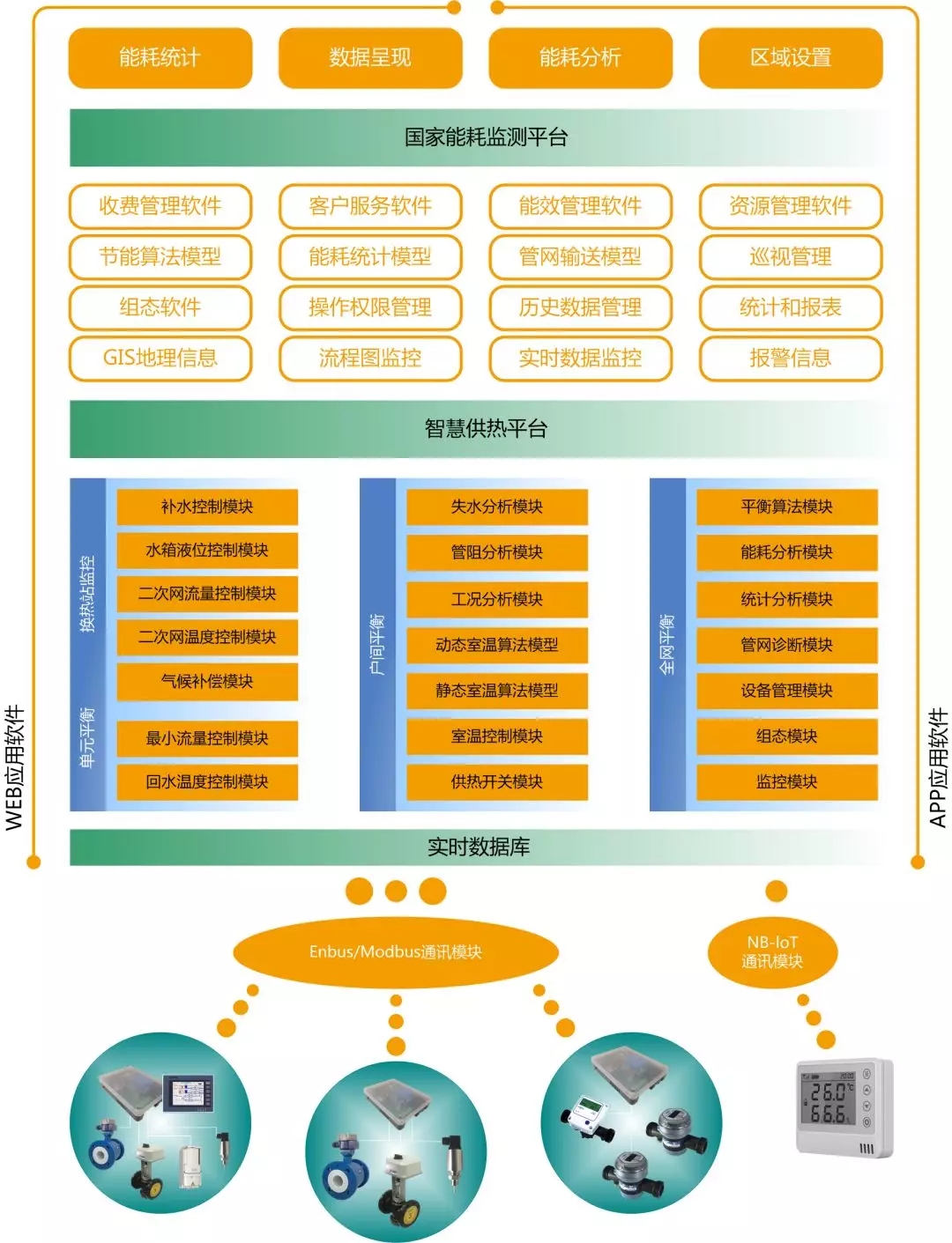 智慧供熱系統(tǒng)由應(yīng)用系統(tǒng)、數(shù)據(jù)系統(tǒng)、通信系統(tǒng)和平衡系統(tǒng)等子系統(tǒng)構(gòu)成。通過換熱站平衡、單元和樓棟平衡和戶間平衡三個層級的熱平衡技術(shù),同時結(jié)合手機APP交互平臺、WEB交互平臺,以及節(jié)能優(yōu)化系統(tǒng)、管路診斷系統(tǒng)、能耗分析系統(tǒng)、設(shè)備管理系統(tǒng)、統(tǒng)計報表系統(tǒng)等,以個性供熱、舒適供熱為目標,對供熱系統(tǒng)進行全數(shù)字化的監(jiān)控和高度智能化的管理,實現(xiàn)系統(tǒng)監(jiān)控、節(jié)能降耗、客戶管理、人員管理、設(shè)備管理、資源管理等綜合管理功能,從而提升熱網(wǎng)運行的綜合效益。