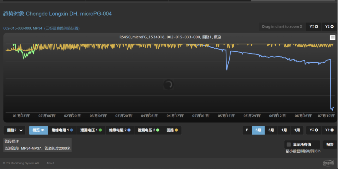 系統(tǒng)通過(guò)預(yù)制在保溫管道保溫層內(nèi)的信號(hào)線(銅線),測(cè)量電化電壓和絕緣電阻的變化,從而判斷是否泄漏。固定監(jiān)測(cè)設(shè)備通過(guò)互聯(lián)網(wǎng)將監(jiān)測(cè)數(shù)據(jù)實(shí)時(shí)上傳至云監(jiān)測(cè)平臺(tái),用戶使用上網(wǎng)設(shè)備可隨時(shí)查看監(jiān)測(cè)數(shù)據(jù)。管道泄漏時(shí)(鋼管內(nèi)漏、PE外護(hù)管外漏),用戶收到報(bào)警信息,通過(guò)現(xiàn)場(chǎng)定位設(shè)備對(duì)故障點(diǎn)進(jìn)行檢測(cè)定位,從而快速處理。