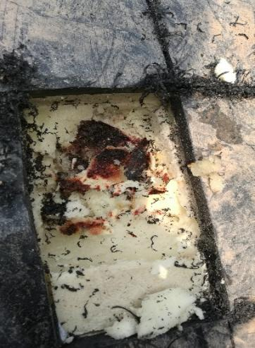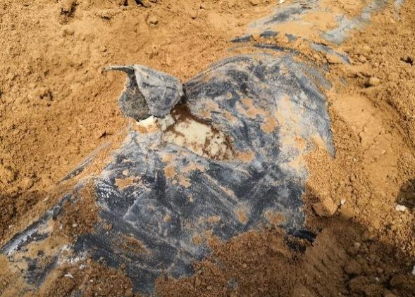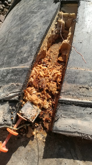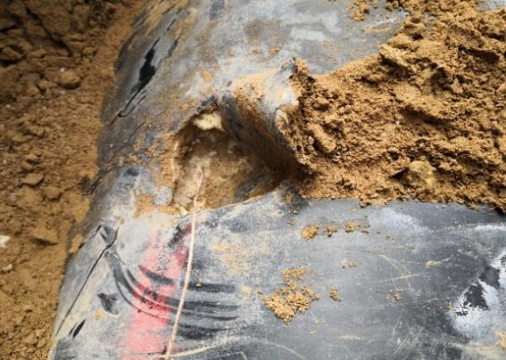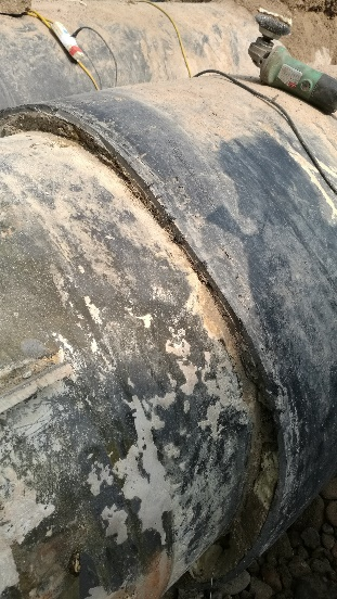 經(jīng)過(guò)雙向測(cè)量定位,最終選取289米處開(kāi)挖,開(kāi)挖后發(fā)現(xiàn)原補(bǔ)口位置碳化嚴(yán)重,且補(bǔ)口往兩側(cè)延伸50cm聚氨酯均被水浸泡(圖10-14)。施工人員隨機(jī)對(duì)浸水保溫進(jìn)行切除后重新補(bǔ)口,有效消除了管網(wǎng)隱患,保證了管網(wǎng)的運(yùn)行安全,并對(duì)延長(zhǎng)設(shè)備使用壽命起到關(guān)鍵作用。