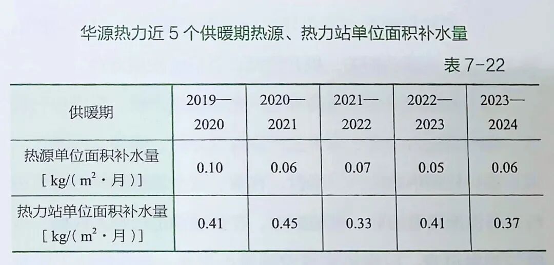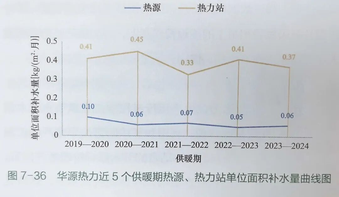 多年來,華源熱力在生產(chǎn)運行過程中,緊抓節(jié)水技術(shù)創(chuàng)新應(yīng)用和精細(xì)化基礎(chǔ)管理,利用智慧熱網(wǎng)管控平臺嚴(yán)格控制管網(wǎng)失水,健全人防與機防相結(jié)合的節(jié)水目標(biāo)管理考評體系,近5個供暖期單位面積補水量始終保持在較低水平,詳情見表7-22、圖7-36。