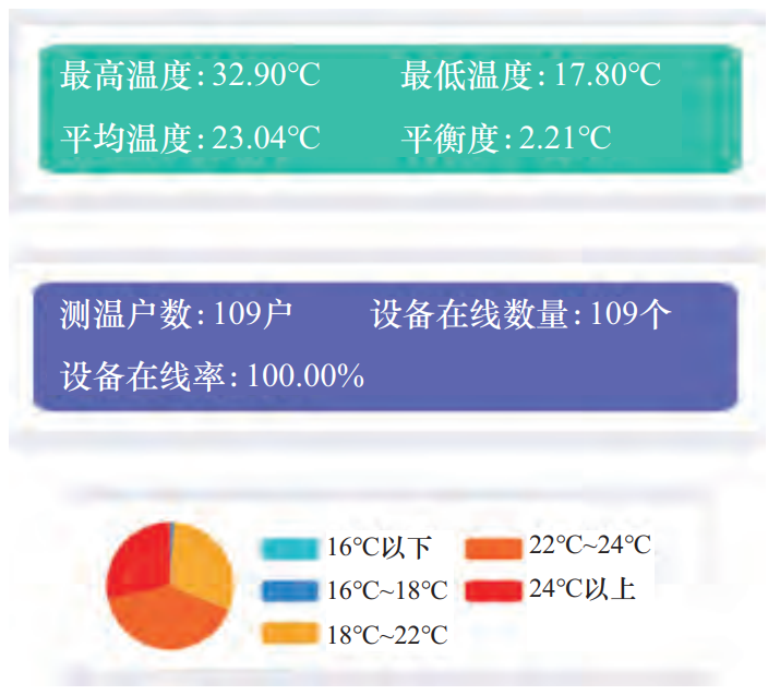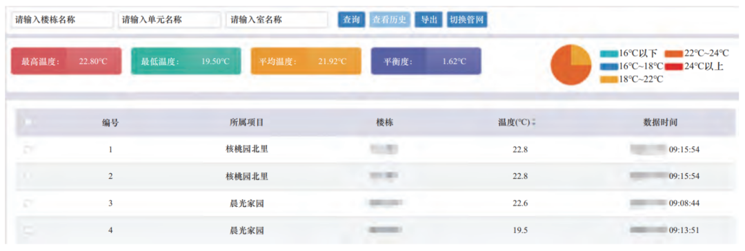 為讓熱源、熱網(wǎng)、熱力站的調(diào)節(jié)能夠不斷精細、合理,讓熱用戶的用熱舒適度不斷提升,縱橫三北熱力近年來對所轄管理范圍內(nèi)的熱用戶共安裝了3000多個室內(nèi)溫度采集器,分布于各項目的重點位置,為供熱系統(tǒng)自動化調(diào)節(jié)提供最直接的目標結(jié)果(圖3)。同時,依托平臺數(shù)據(jù)計算能力,引入熱量平衡的概念,嘗試建立熱量平衡標準,來驗證水力平衡調(diào)試結(jié)果。