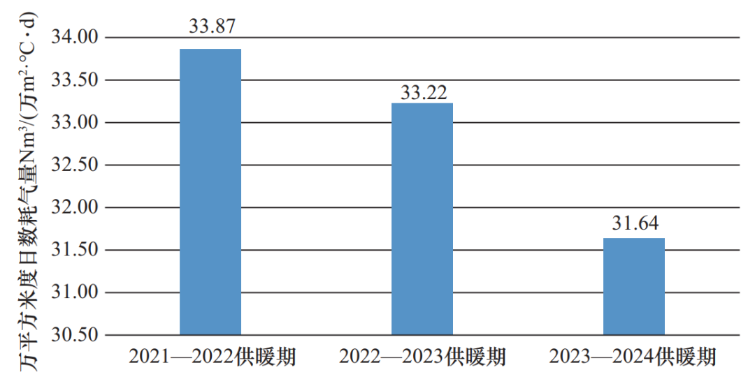 2022—2023供暖期萬平方米度日數(shù)耗氣量較上個供暖期下降了 0.65Nm3/(萬m2·℃·d),下降率達2%,2023—2024供暖期萬平方米度日數(shù)耗氣量較上個供暖期下降了1.58Nm3/(萬m2·℃·d),下降率達4.8%。