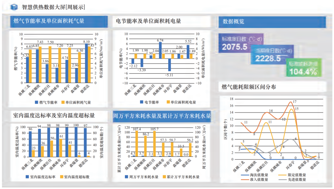 為進一步提升管理標準,縱橫三北熱力全面開展內(nèi)部項目間的數(shù)據(jù)對標,將氣、水、電、熱等能耗指標與室內(nèi)溫度、投訴(等服務(wù)指標)橫向?qū)耍C合考量項目區(qū)域、天氣、年代等因素的影響,劃定內(nèi)部參考標準,按照日、周、月等不同時間維度,對項目橫向考量,對標結(jié)果內(nèi)部公示,樹立內(nèi)部標桿(圖7)。